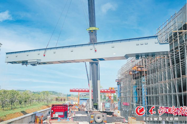 记者24日在黄花国际机场前方不远处看到,目前长沙磁浮快线区间开岔工程已完成钢盖梁墩柱、道岔梁施工,正在进行道岔梁上道岔安装。徐超兵介绍,开岔施工需拆除长沙磁浮快线黄金大道特大桥24-26号桥墩及双线简支梁,新建门式墩钢盖梁支撑,然后采用横向顶推的方式,换入一孔四线道岔梁。